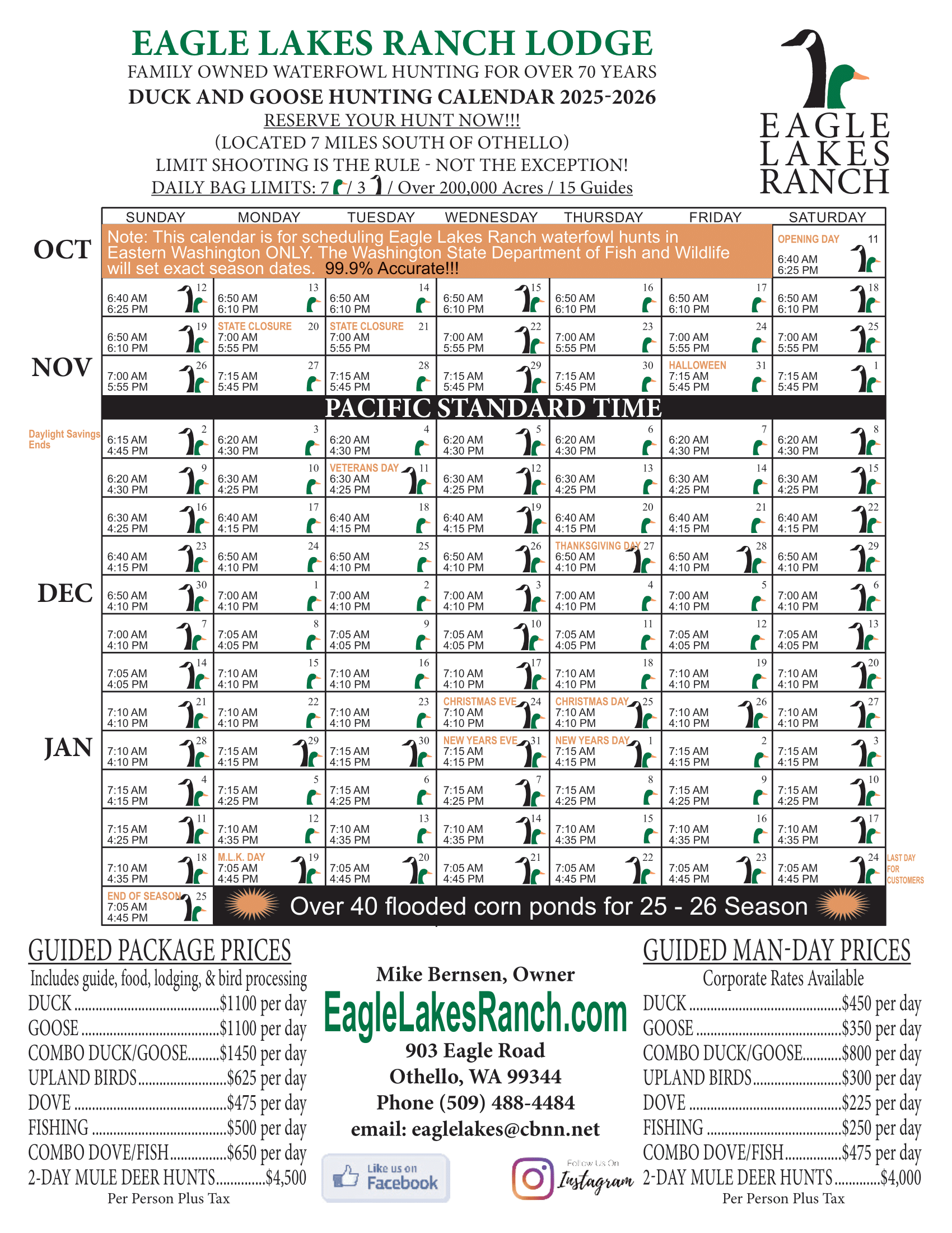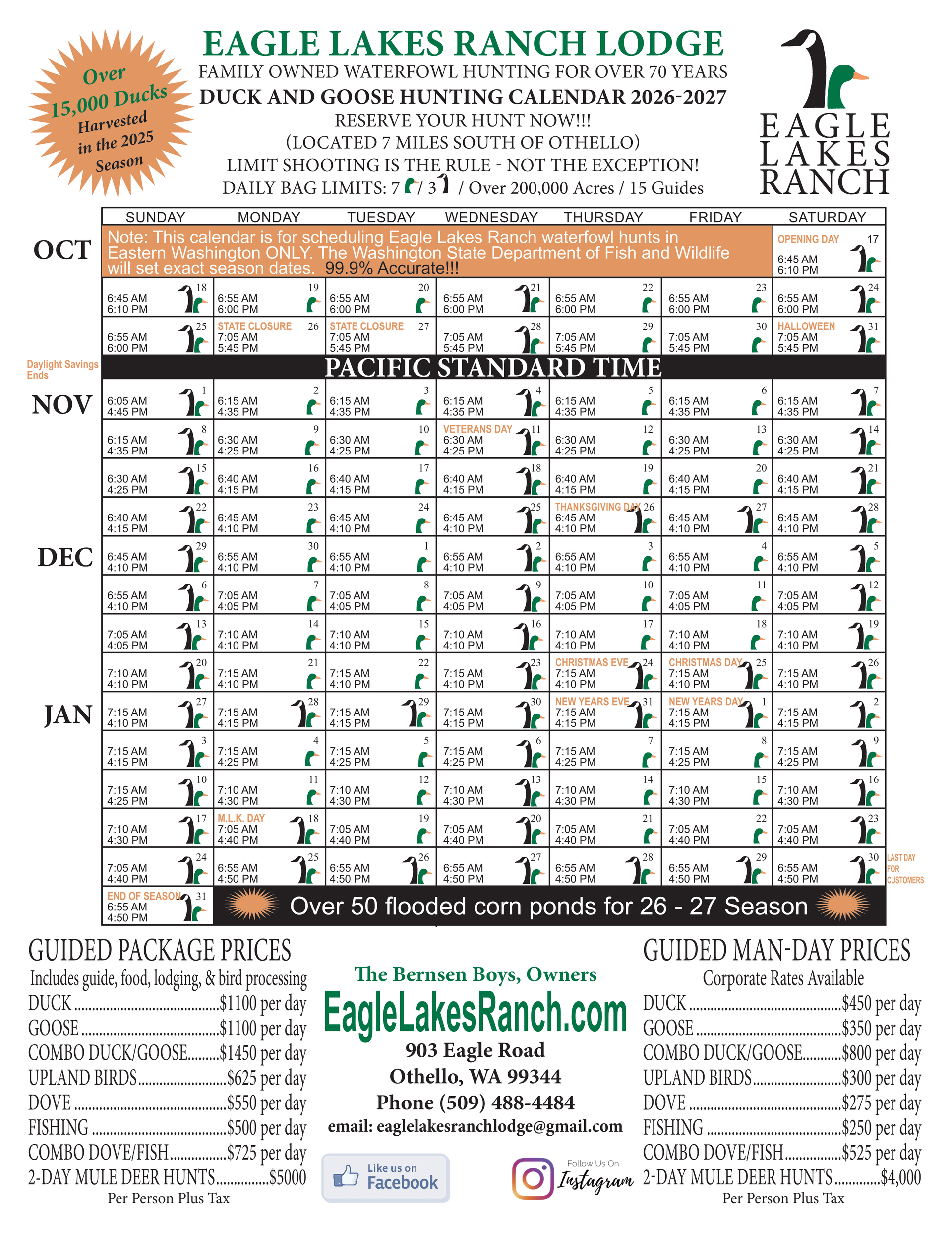Be sure to bring a gun and ammo. If you want us to assist you in getting shells, please let us know. Steel shot is required for waterfowl. #1's, #2's or #4's for Ducks -BBB or BB shot is recommended for Geese. Rental guns available upon request, $75.00 per gun.